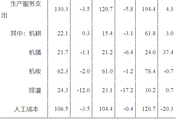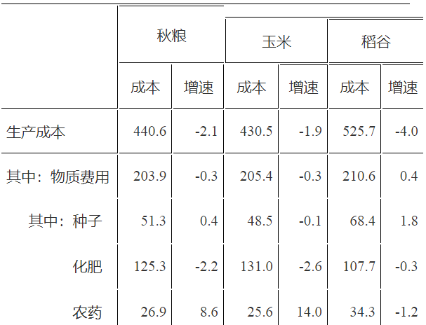 单位:元/亩(成本)、%(增速)