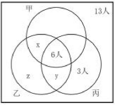 根据题意,该单位没有甲、乙、丙三项认证中任何一项的职工人数为 65×(1-80%)=13 人。如图所示,设仅有甲、乙两项认证的人数为 x 人,仅有乙、丙两项认证的人数为 y 人,仅有乙认证的人数为 z 人。则没有甲认证的职工人数为(z+y+3+13)人,有乙认证的职工人数为(z+y+x+6)人,根据题意可得:z+y+3+13=z+y+x+6,解得 x=10,即仅有甲、乙两项认证的人数为 10 人。